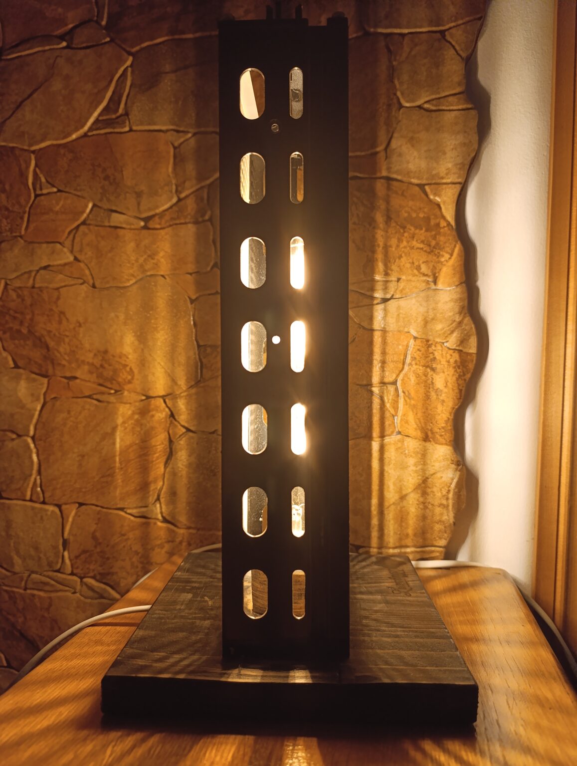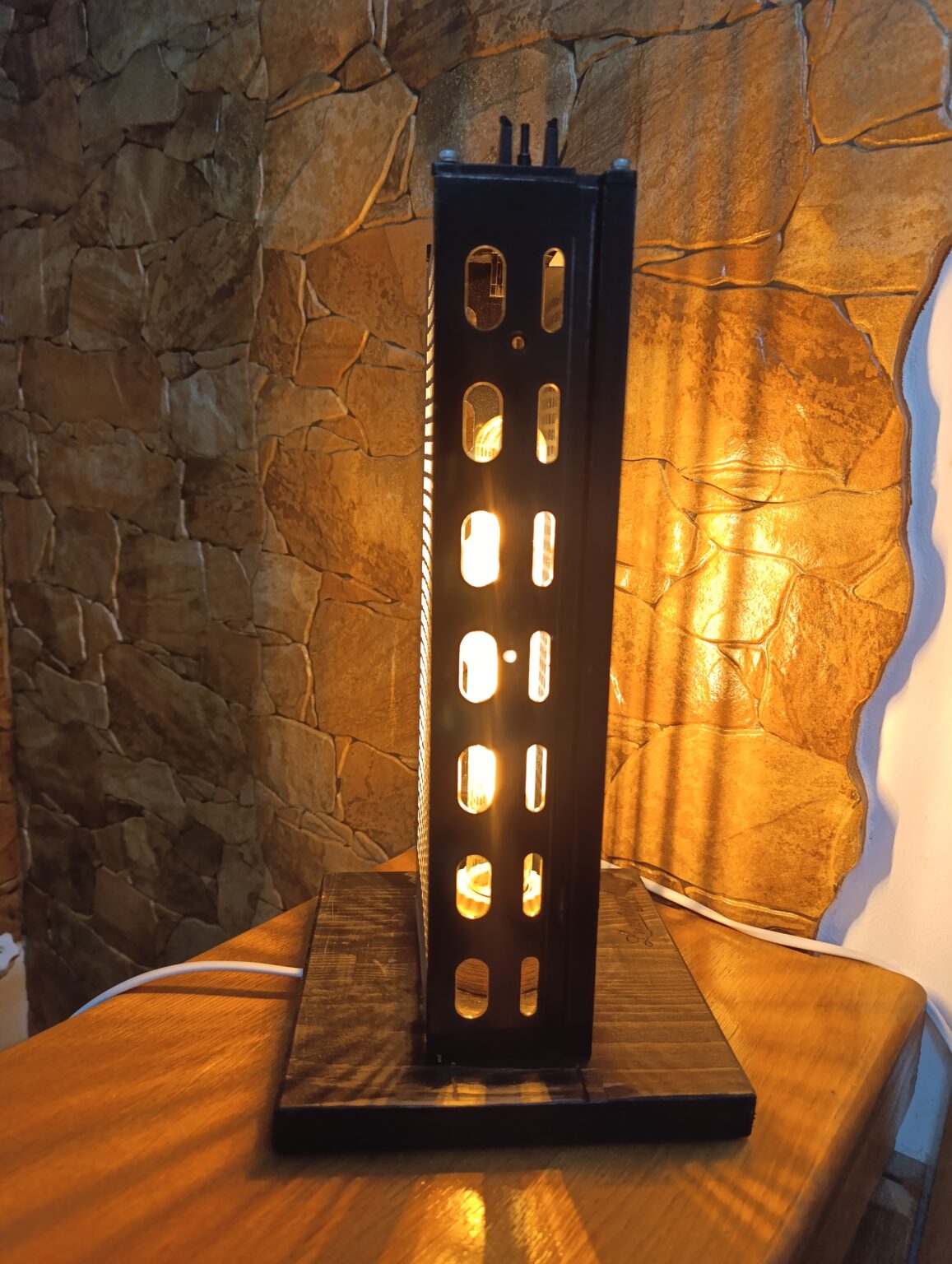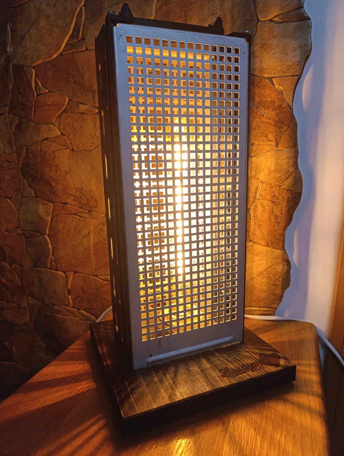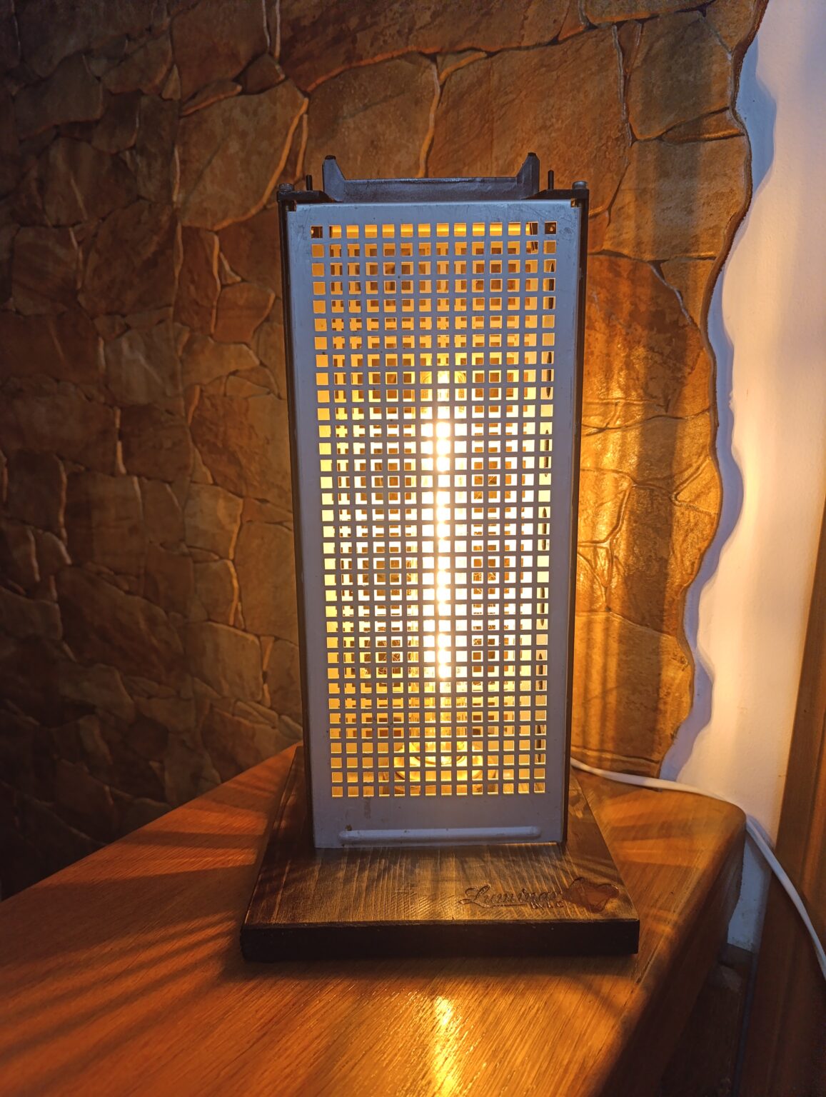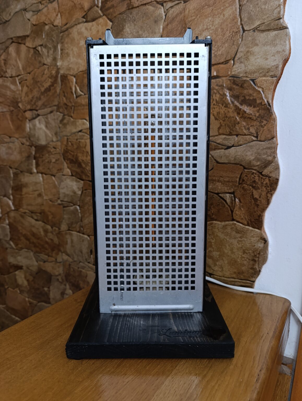 O piesă atipică pt Luminar …o combinație de lemn și metal dar în această lucrare metalul primează. Lumina filtrată de carcasa metalică are un aspect aparte.